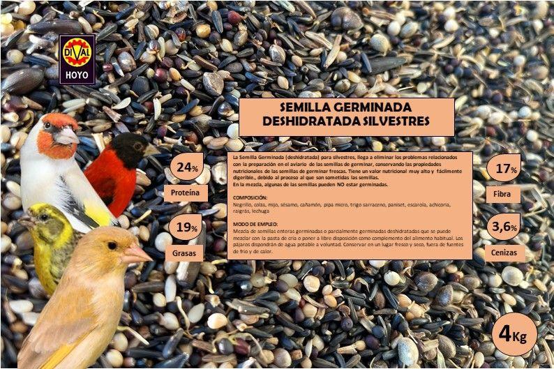La Semilla Germinada (deshidratada) para silvestres, llega a eliminar los problemas relacionados con la preparación en el aviario de las semillas de germinar, conservando las propiedades nutricionales de las semillas de germinar frescas. Tiene un valor nutricional muy alto y fácilmente digerible., debido al proceso al que son sometidas las semillas. En la mezcla, algunas de las semillas pueden NO estar germinadas